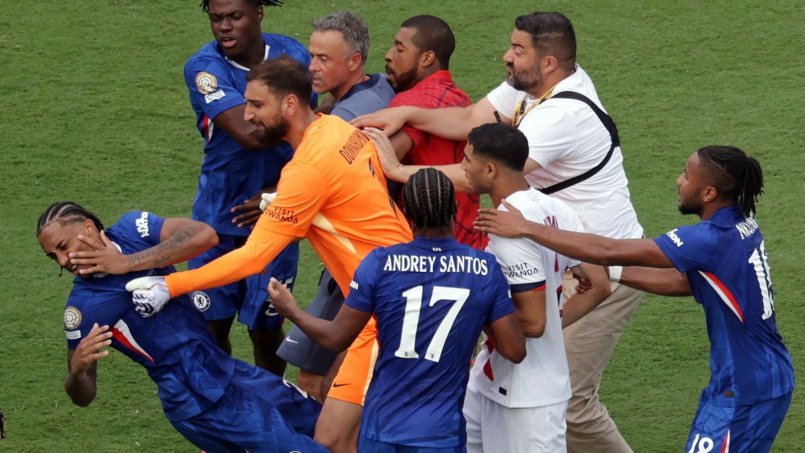 PSG coach Luis Enrique appeared to grab at Pedro’s neck while he and Donnarumma confronted Chelsea players.